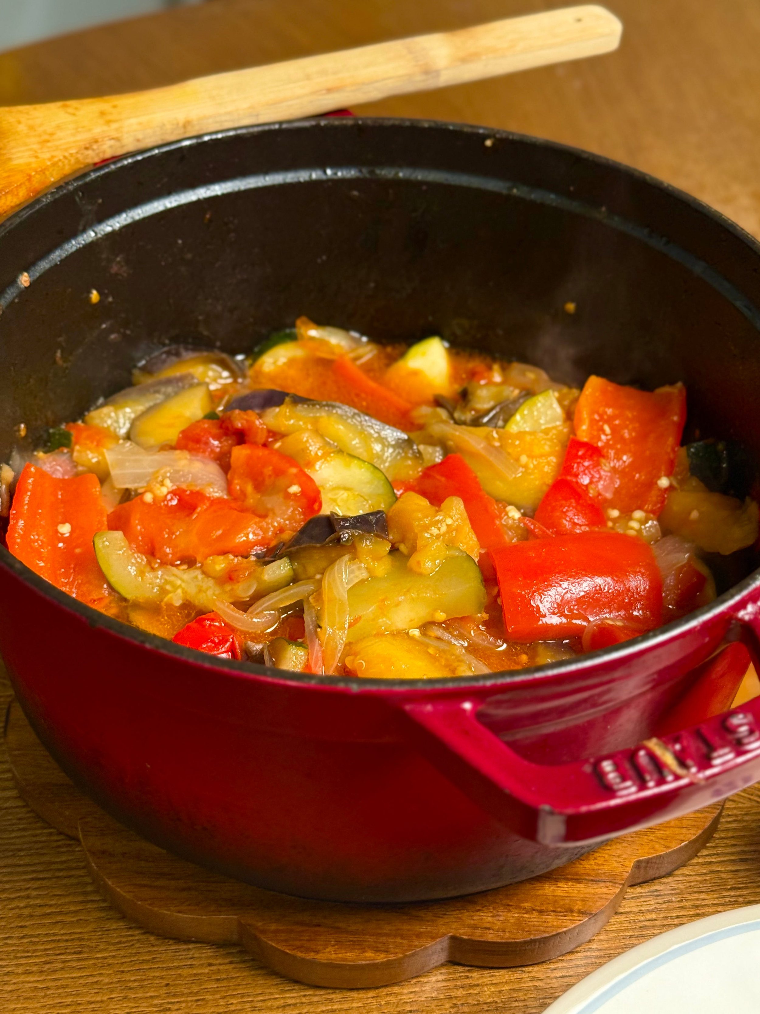 Semi-cover and cook on low for 30–40 minutes, until the vegetables are tender but not mushy.