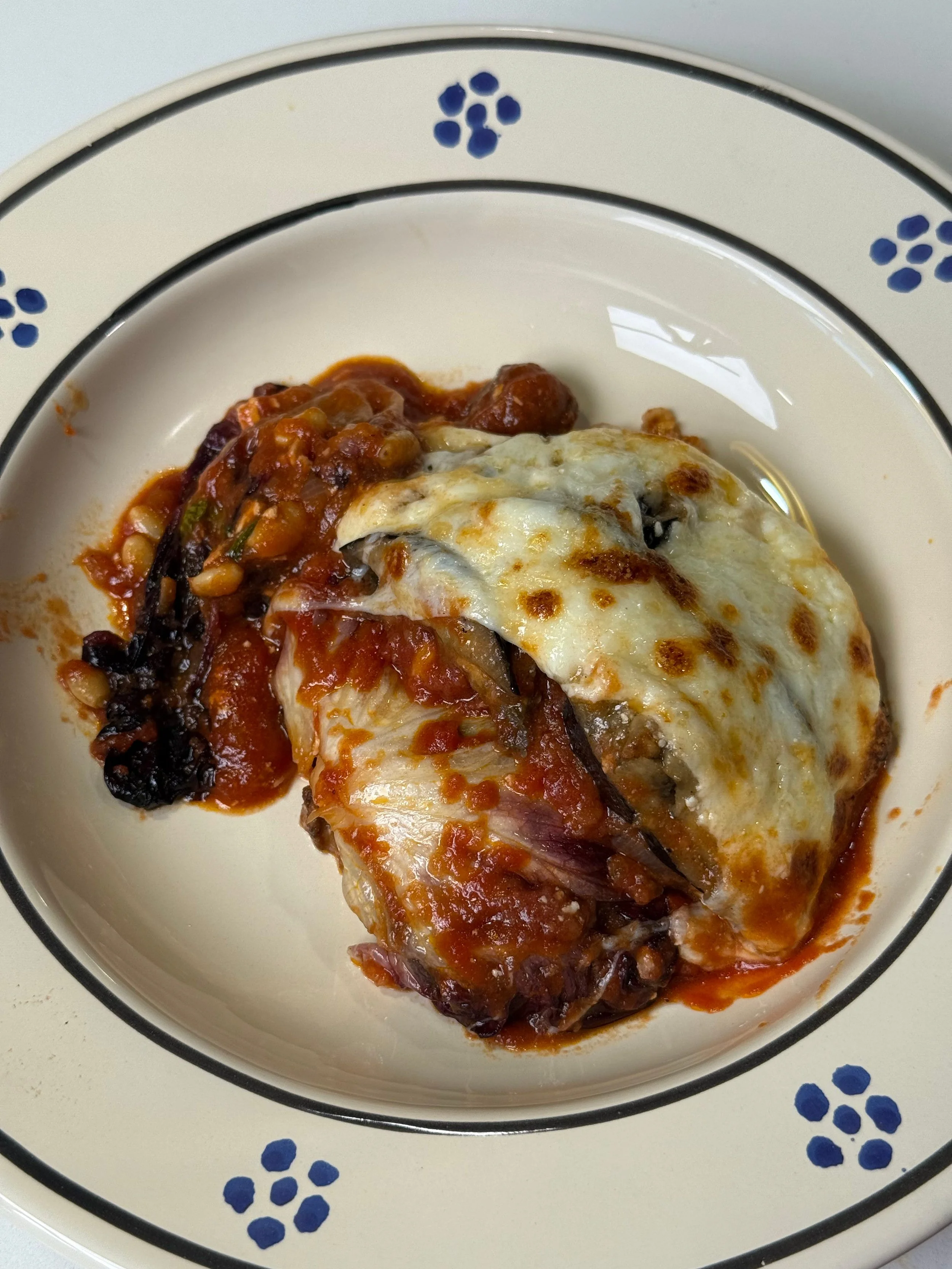 My Eggplant & Radicchio Parmigiana recipe is inspired by my time in Sicily. I altered the original but still leaned into Sicilian tradition, layering in pine nuts, raisins, and ricotta salata alongside the usual eggplant and mozzarella. What makes this dish so special is its balance of flavors and textures: the slight bitterness of radicchio, the sweetness of raisins, the crunch of pine nuts, the salty edge of ricotta salata, the tang of tomato sauce, and the gooey savoriness of melted cheese. It’s a true Sicilian-style explosion of taste.