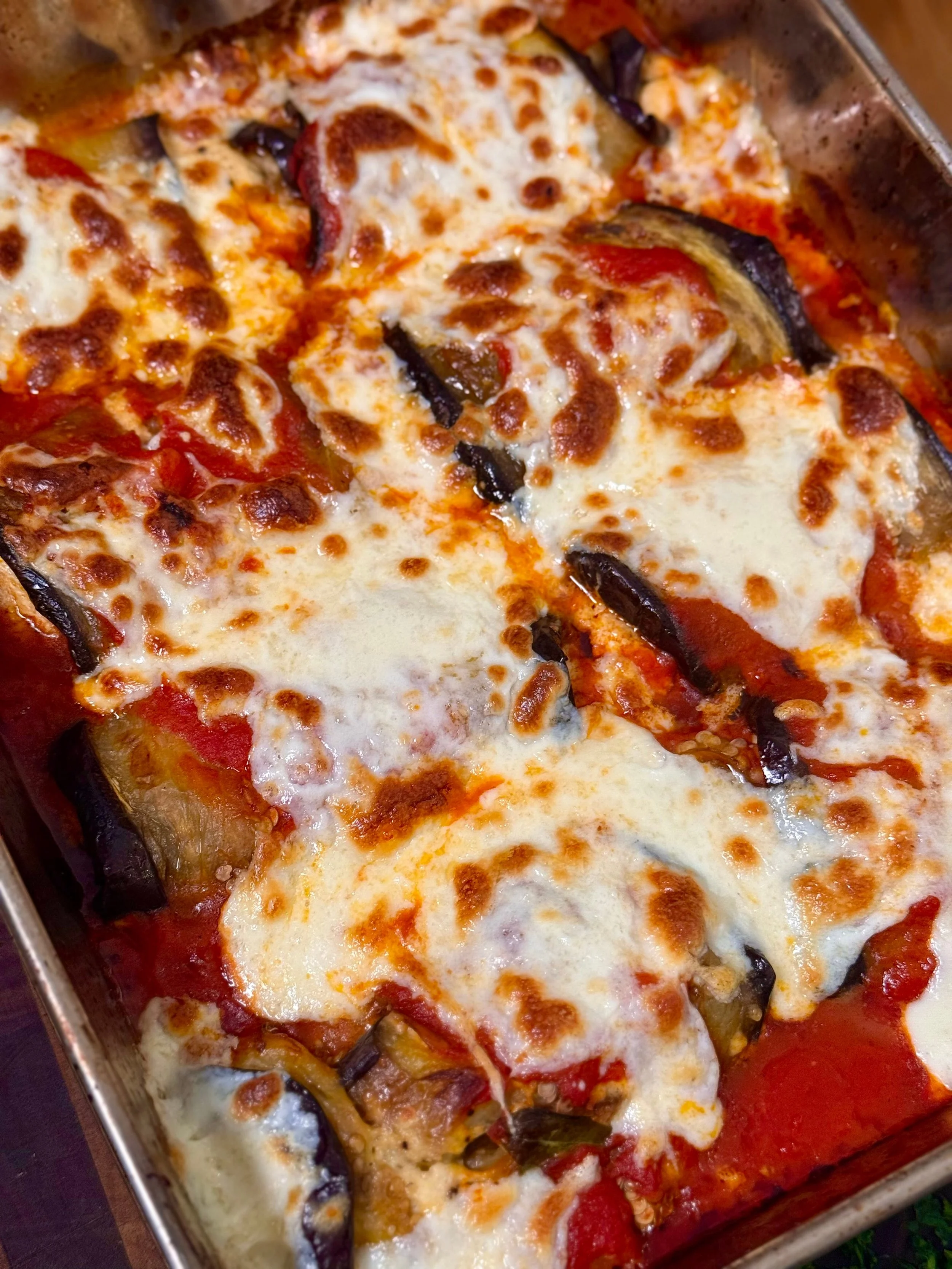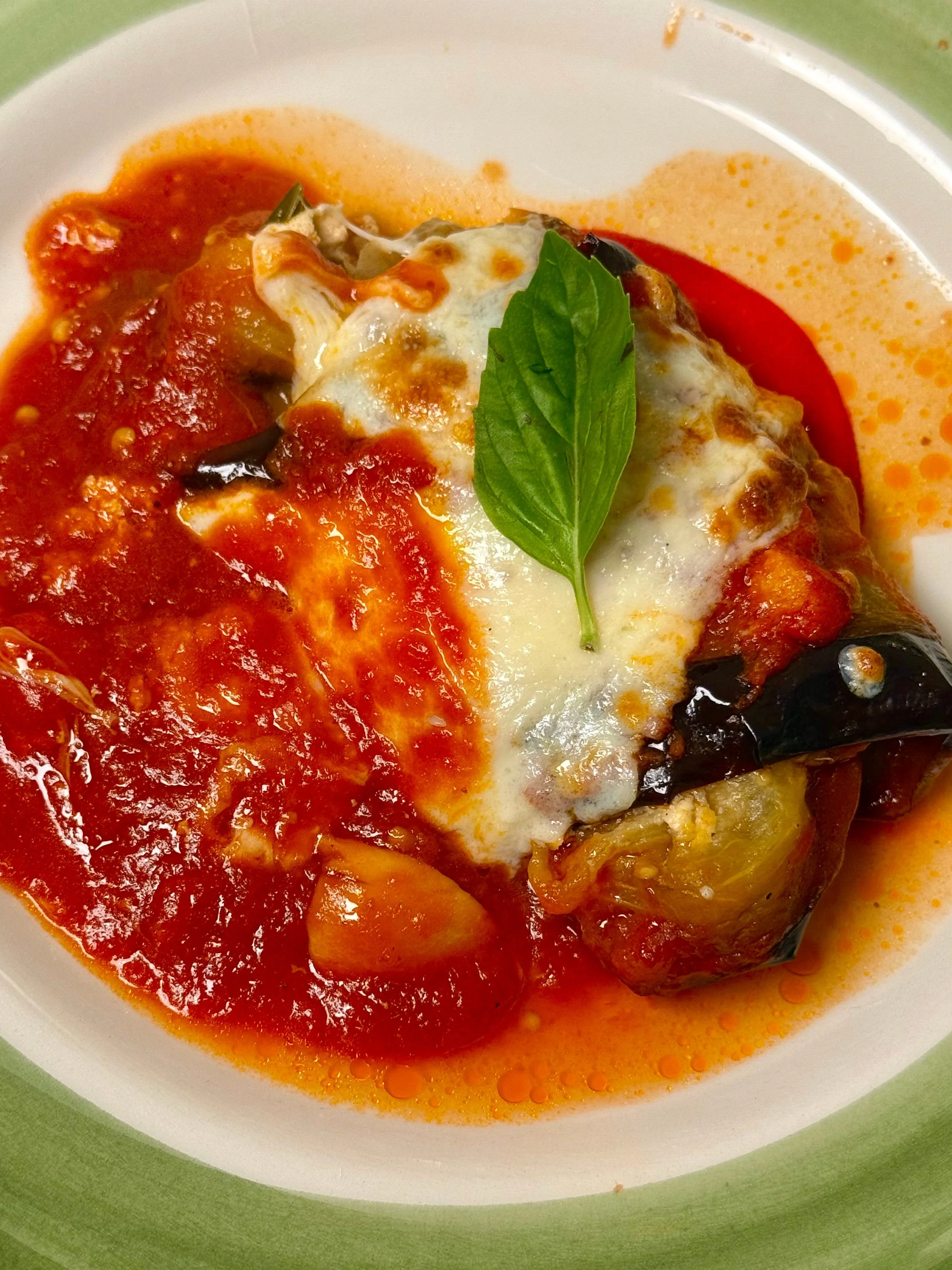 Thin slices of eggplant rolled around creamy ricotta and baked in tomato sauce until soft, bubbling, and golden. A low-effort meal that looks like a lot of effort.